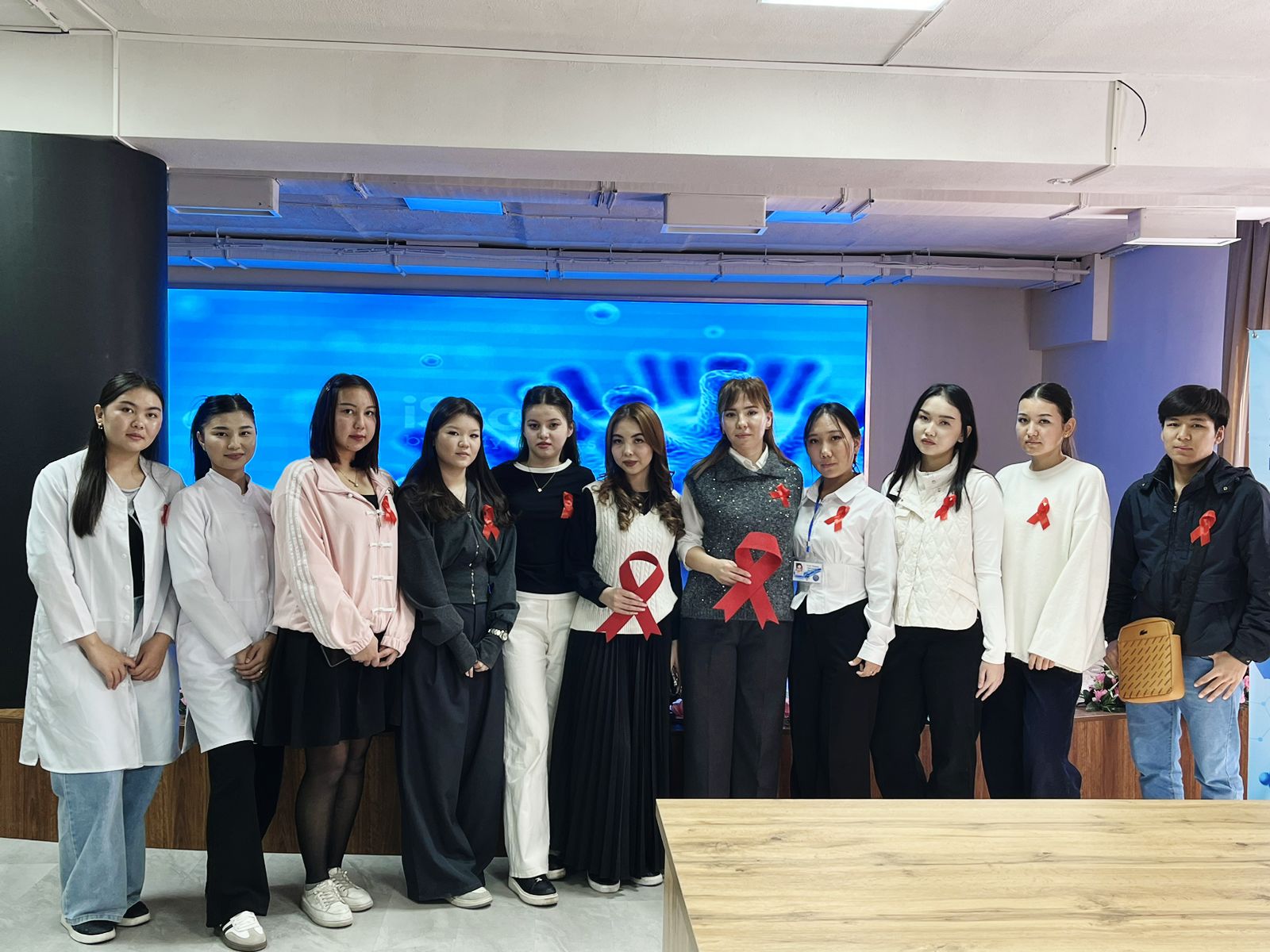 АИТВ-ны алдын алу бойынша парақшалар таратылды. Студенттер тарапынан қойылған сүрақтарға бөлім менгерушісі Байдилдаева Улпан Сагинтаевна жауап берді. Елшібай Шоқан Елдібайұлы эпидемиолог комекшісі еркті жедел тест жүргізді.