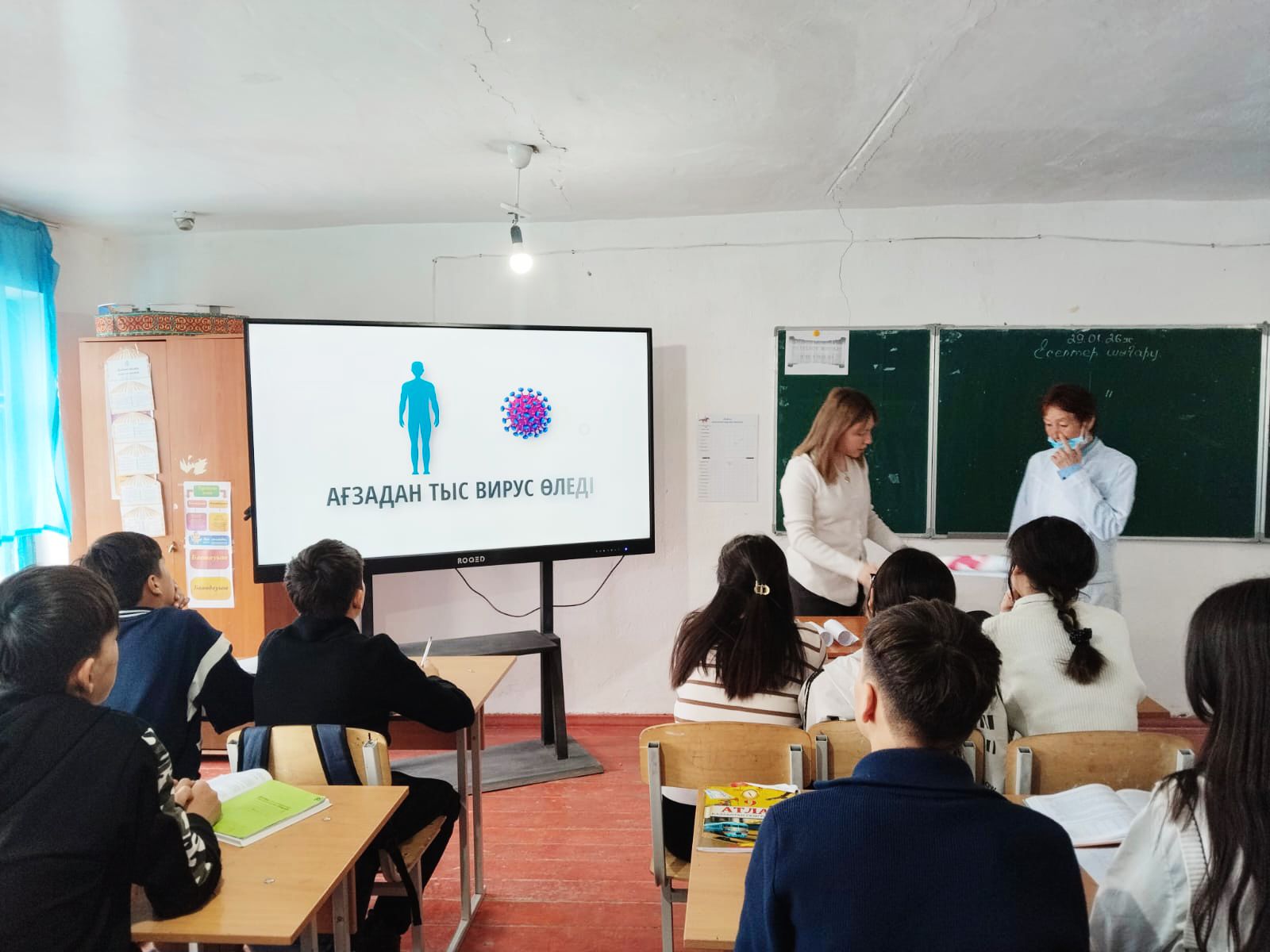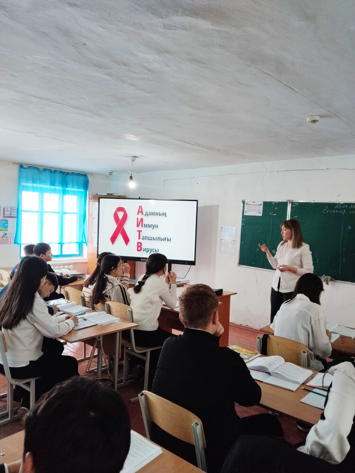 АИТВ - инфекциясын жастар арасында алдын алу АИТВ -мен өмір сүретіндерді кемсіту мен таңбалаудан қорғау жөнінде түсіндіру жұмыстарын жүргізді. Бейнероликтер көрсетілді,парақшалар,брошюралар таратылды. Оқушылар тарапынан қойылған сұрақтарға толық жауап беріліп қанағаттандырылды.