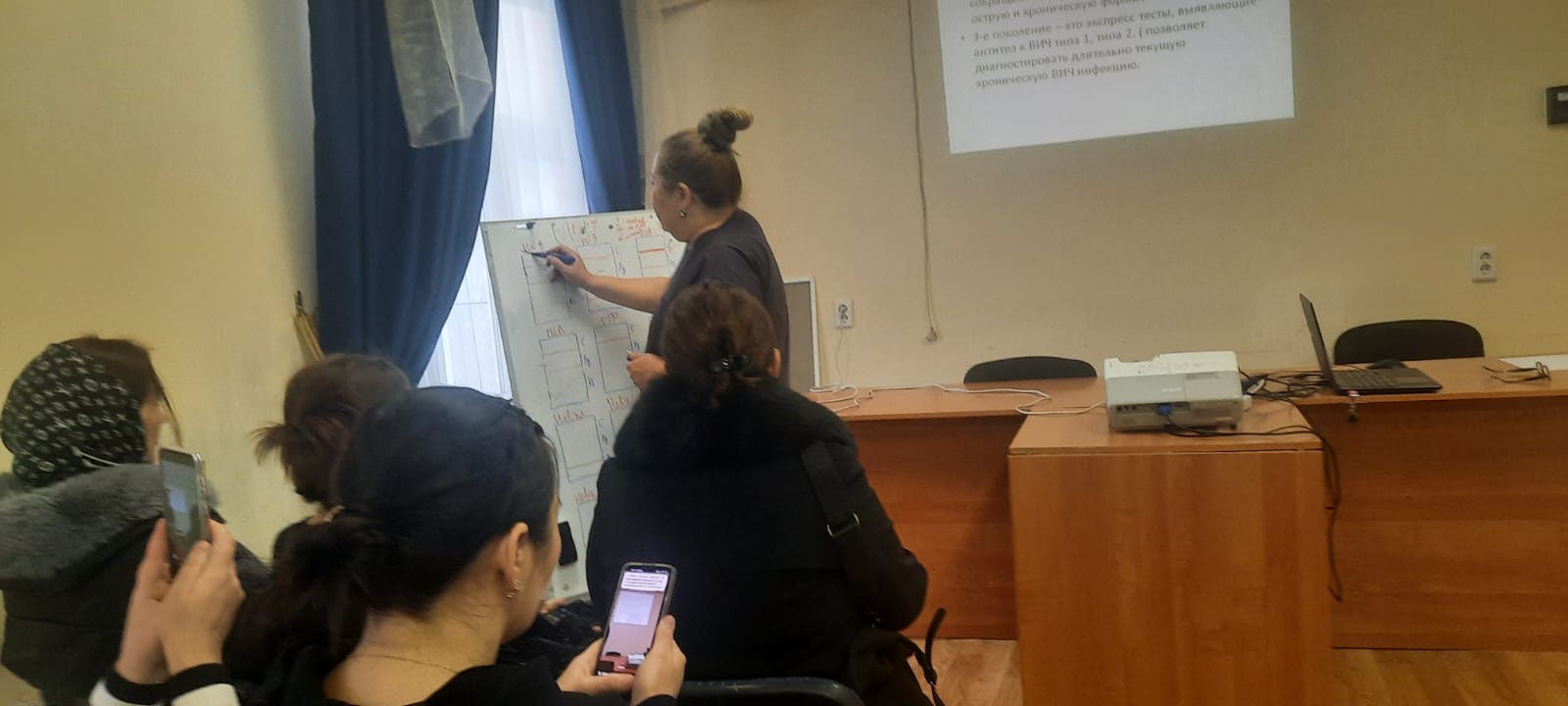 В ходе обучения специалист диагностической лаборатории С. Д. Сметова презентовала методику проведения и интерпретации результатов экспресс-тестирования на ВИЧ. Показала примеры различных (положительных, отрицательных, невалидных) результатов экспресс-теста на ВИЧ, провела практические занятия по оценке результатов экспресс-тестирования на ВИЧ.